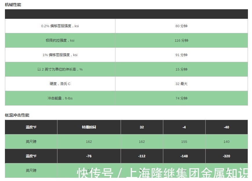 2507 不推荐用于需要长时间暴露在超过 570°F 的温度下的应用,因为韧性降低的风险增加。此处列出的数据是锻造产品的典型数据,除非特别说明,否则不应视为最大值或最小值。
