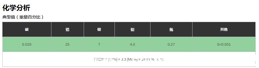 合金 2507 是一种超级双相不锈钢,含有 25% 的铬、4% 的钼和 7% 的镍,专为需要卓越强度和耐腐蚀性的苛刻应用而设计,例如化学加工、石化和海水设备。该钢具有优异的耐氯化物应力腐蚀开裂性、高导热性和低热膨胀系数。高铬、钼和氮含量可提供出色的抗点蚀、缝隙腐蚀和全面腐蚀的能力。